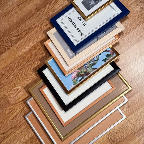 Set med flera ramar i olika storlekar och färger. Ramarna är av varierande storlek och design, inklusive svarta och vita ramar. Passar för olika typer av bilder och konstverk.