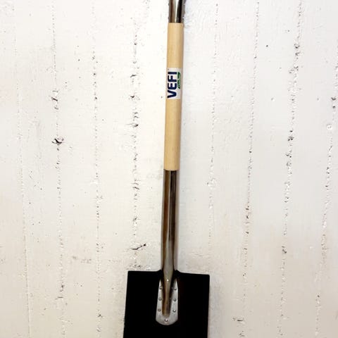 Fiskars spade med trähandtag och svart metallspade. Verktyget är avsett för grävning och trädgårdsarbete. Handtaget är tillverkat i trä och spaden i metall, vilket ger hållbarhet och stabilitet vid användning.