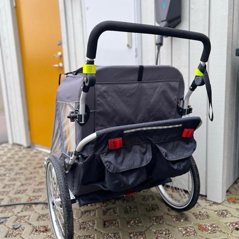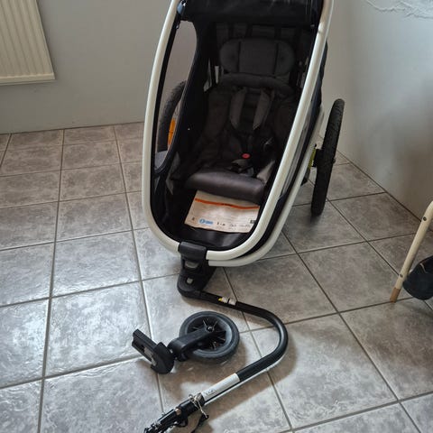 Helt ny cykel/ aktivitetsvagn, endast uppackad. Allt som finns på länken till Jollyroom ingår, cykelstång och flagga.