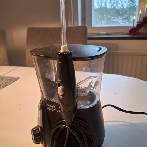 en Sodentist vattenflosser som är i nyskick. Enheten har endast provats utan att ha kommit i kontakt med munnen, vilket garanterar fullständig hygien.
