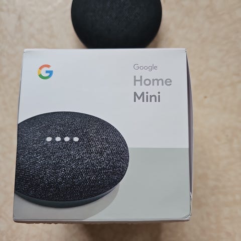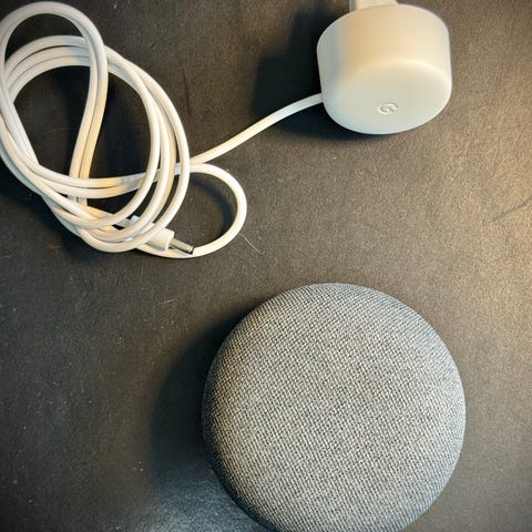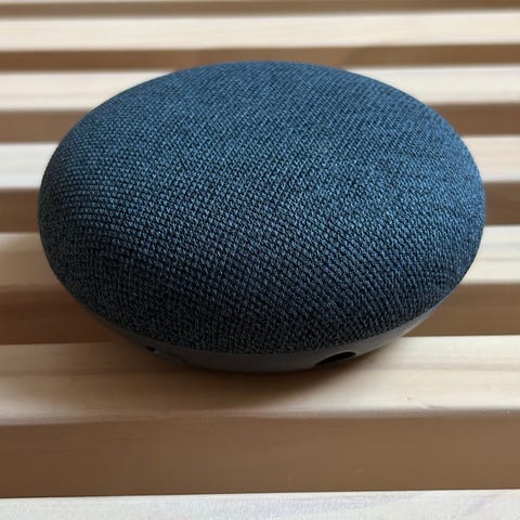 Google smart högtalare i grå färg. En liten rund enhet med tygöverdrag. Det är en smarthögtalare så man kan t.ex. sätta timers, spela musik mm bara med rösten. Super smidigt när man lagar mat samtidigt.