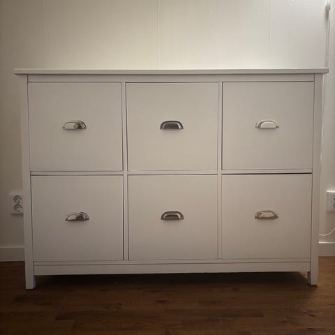 Säljer en charmig vit byrå/sideboard i klassisk stil. Passar perfekt i vardagsrum, hall eller sovrum. Stabil och rymlig med både lådor och skåp.