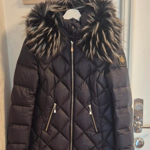 Chiara Forthi vinterjacka i svart färg, storlek 42, tillverkad av dunmaterial. Jackan har en vadderad design med dragkedja framtill och en huva med avtagbar päls. Materialet består av 80% dun och 20% fjädrar med yttertyg i nylon och foder i polyester.