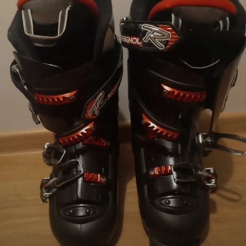 Rossignol skidpjäxor i svart och röd färg, storlek 235mm (275mm) Pjäxorna har fyra spännen för justering och är avsedda för skidåkning.