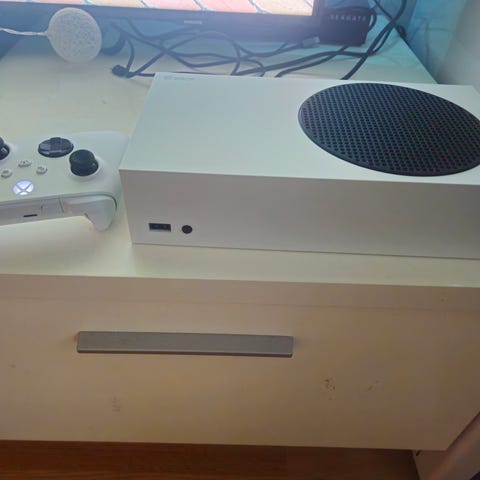 Xbox Series S spelkonsol med 512 GB SSD-lagring i vit färg. Konsolen är en del av Xbox Series och har en kompakt design. Inkluderar trådlös handkontroll och nödvändiga kablar för anslutning och användning.