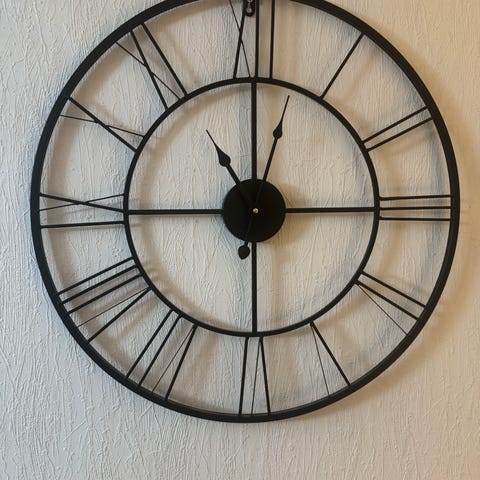 Stor dekorativ väggklocka i metall. Urverket måste fixas. Från Perfect Home. Diameter ca 46 cm plus det som står upp ovan. Finns i Borlänge.