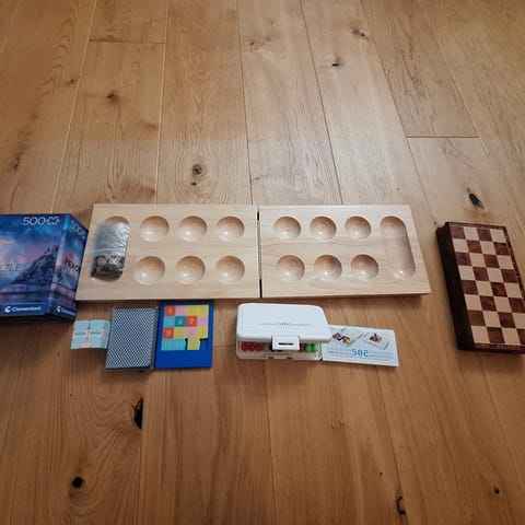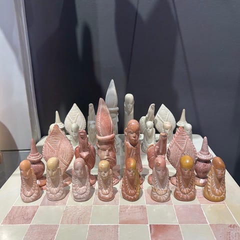 Schackspel i sten med låda i trä. Fint skick. Kan skickas.