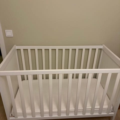 IKEA spjälsäng i vitt trä. Passar för små barn och är utformad för att ge säker och bekväm sovplats.