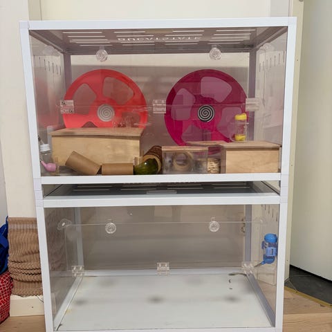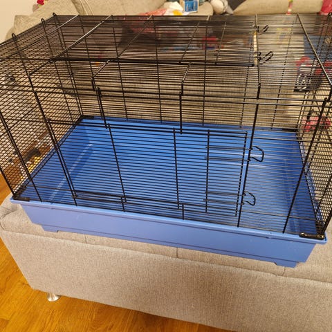 Två separata burar som vi har satt ihop med rör, för en trevåningsbur.
