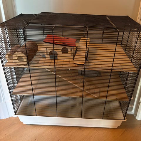 Bur för smådjur med flera tillbehör inklusive mat- och vattenskålar och leksaker.