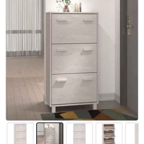 Skoskåp i massiv furu. Svartmålat av förra ägaren, och kvaliteten på det jobbet lämnar väl lite att önska (men om man inte synar det så noga eller har lite nedsatt syn ser det helt okej ut). Köptes som tilltänkt ommålningsprojekt, men vi kom inte så långt innan det stod klart att vi inte längre har plats för det.