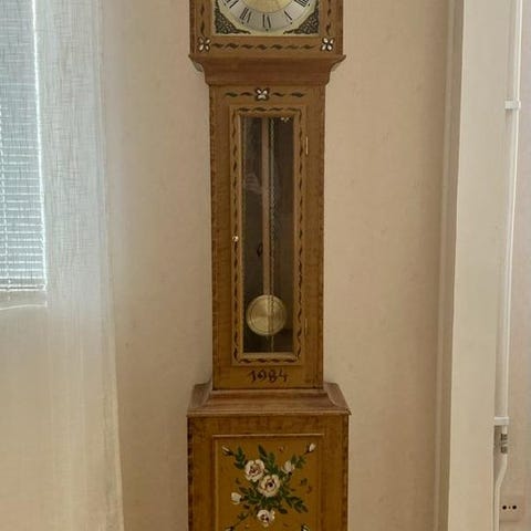 Välvårdat golvur modell Westerstrand i mörkbetsat trä, 1980-tal. Fungerar bra.