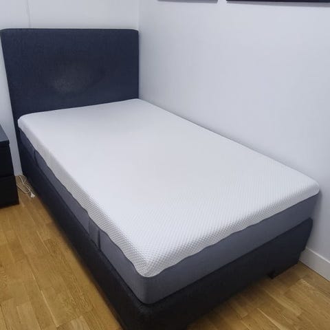 IKEA säng med stoppat sänggavel. Sängen har en beige färg och är utrustad med en stoppad sänggavel med dekorativa nitar. Mattress ingår och är täckt med ett beige överdrag. Den är fel ny