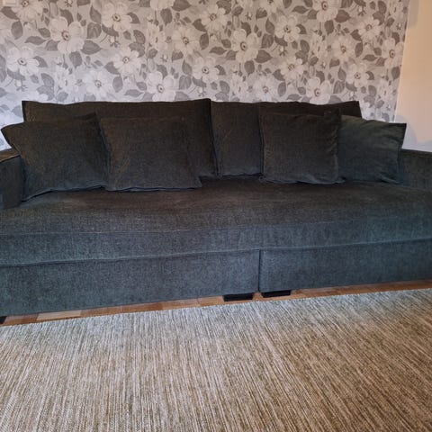 Mått: höjd 85 cm, djup 95 cm, sittbredd 90 cm, sittdjup 58 cm, sitthöjd 45 cm, benhöjd 15 cm. Soffan har avtagbara klädslar på kuddar och dynor.