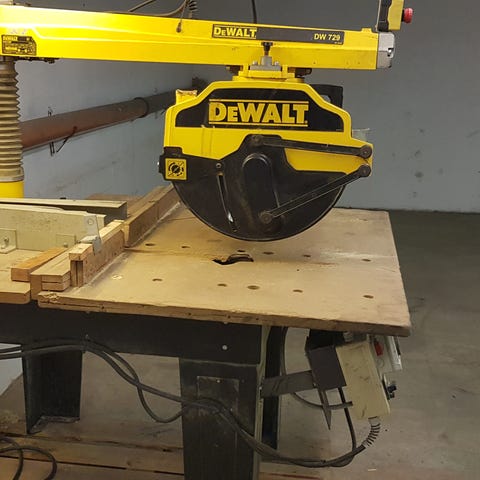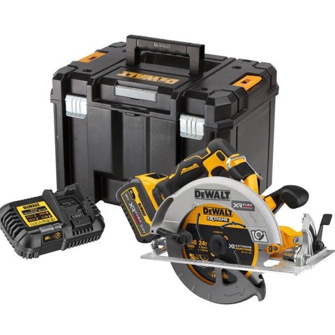 DeWalt DW717XPS cirkelsåg med skena. Utrustad med en 230 mm klinga, kapacitet för 70 mm djup och 45 graders lutning. Maskinen har en effekt på 1600 W och är avsedd för kapning av trä och liknande material.