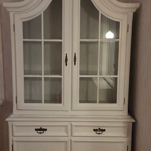 Vitrinskåp Liatorp från Ikea säljes (har utgått ur sortimentet). Belysning är insatt och orginalknopparna är bytta till knoppar i antikmässing. 5 hyllplan varav 3 i glas. I mycket fint skick!