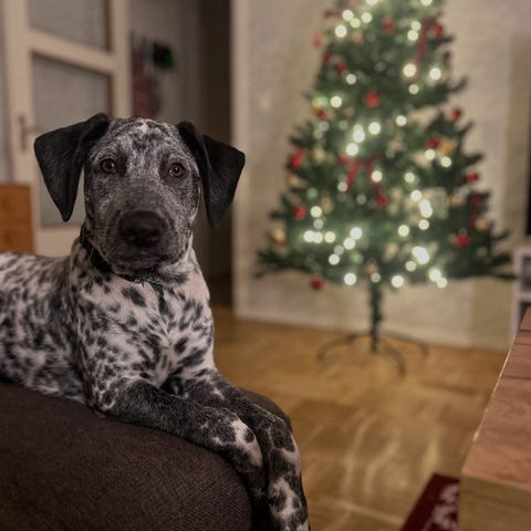 Mamma Kakan – snart 3 år, Border collie/Springer spaniel/Jämthund-mix. Mankhöjd 52 cm, ca 18-20 kg. Lika snäll som Birk, älskar familjen och andra hundar, typisk “knähund” som gärna ligger nära.