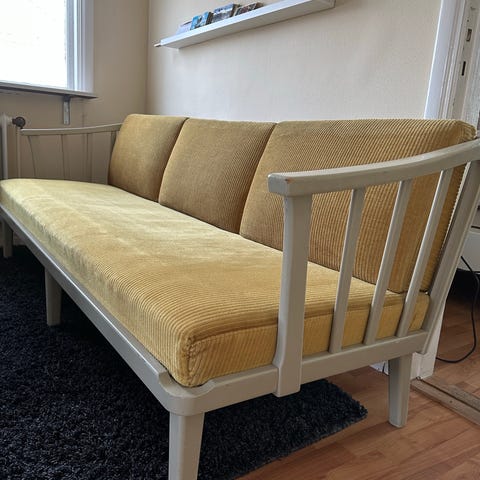 Carl Malmsten soffa med stabil stomme men är tydligt sliten.