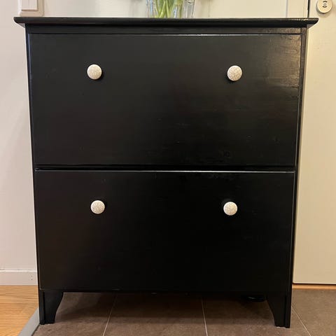 Det saknas en skruv i skofacket/lådan där skorna placeras, vid den del som fungerar som stopp när man stänger. Detta påverkar inte funktionen eller användningen av skåpet.