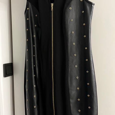 Modell Bienne, med rund halsringning, avskuren midja och formad A-linje med isättningar i kjolen och lång guldfärgad dragkedja bak. Bomull/elastan (spandex).