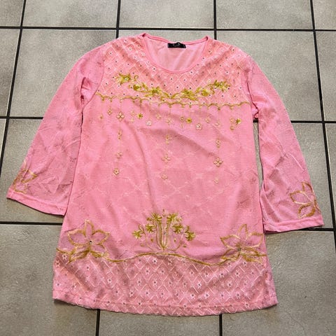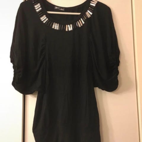 Vit blus från Eight Paris med inslag av silvertråd. Fin glans och fallande material. Halvpolo. Loose-fit och passar kvinnor som bär både small och medium. Rymlig och normal i storleken.