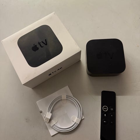 Apple TV 4K med fjärrkontroll och strömkabel.