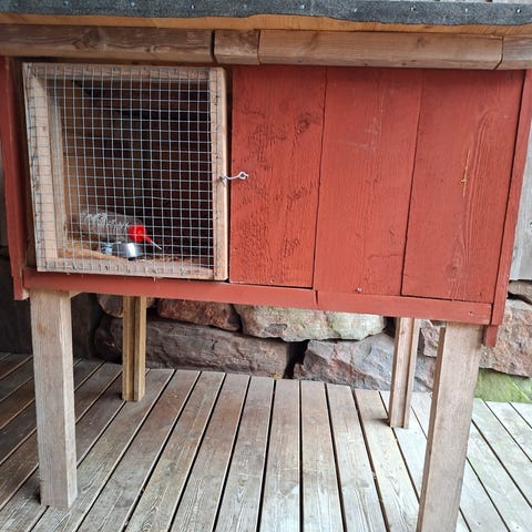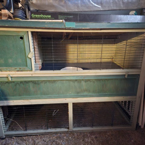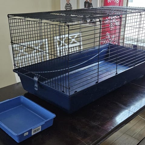 Vi har använt den till en kanin, lite sliten i burens botten men fortfarande en fin bur. Buren är rengjord.