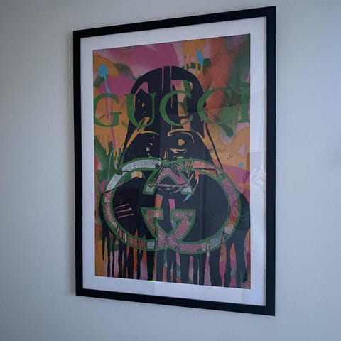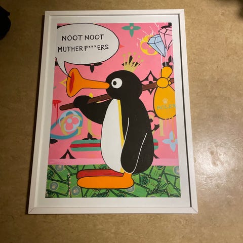 Säljer en färgstark och unik street art-tavla med pingvinmotiv