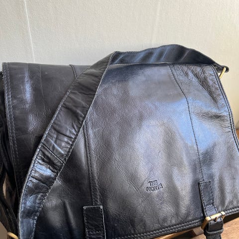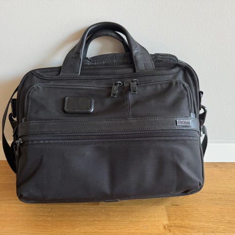 Ballistisk nylon med läderdetaljer. Orange innertyg. Några sömmar invändigt som släpper, i övrigt i mycket bra skick. Nypris vid inköp ca 6500 kr.