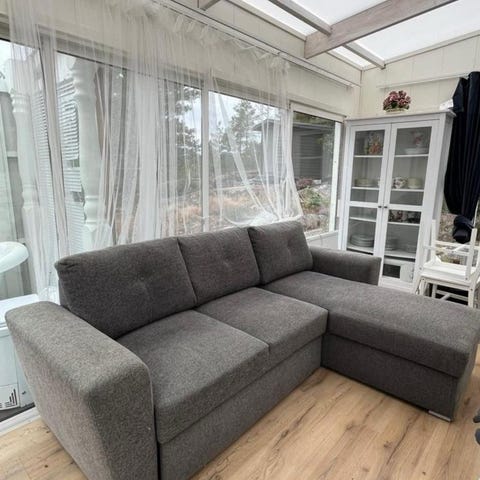 3-sits soffa med tygklädsel. Soffan görs enkelt om till en säng. Sittdynor med pocketfjädrar och skumstoppning. Ryggdynor i skum. Med förvaring. Kan spegelvändas.