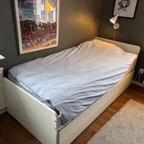 IKEA säng med utdragbar extrasäng och förvaringslådor. Sängen har måtten 206 cm i längd, 96 cm i bredd och 72 cm i höjd. Extrasängen är utdragbar och passar för extra sovplats. Sängen har även förvaringslådor under huvuddelen för praktisk förvaring.