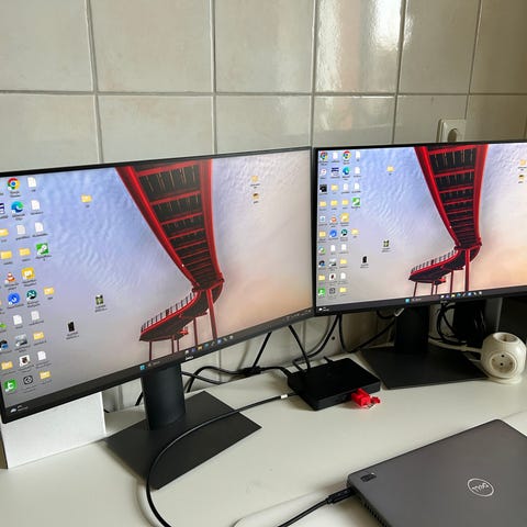 Kan kopplas med USB C alltså 1 kabel som levererar både ström och bild. Laddar via usb c 65w.