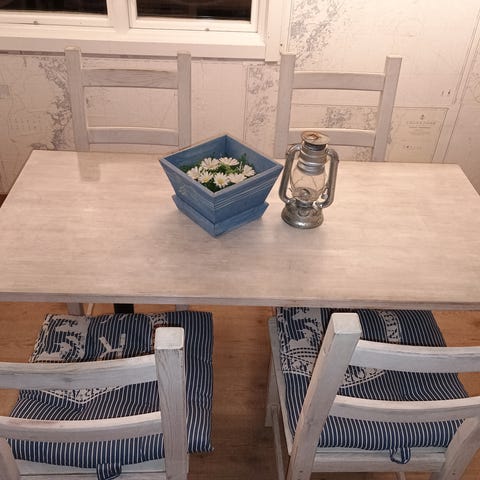 KEA matbord med två stolar i rotting och metallben. Passar perfekt för mindre matplatser eller kök.