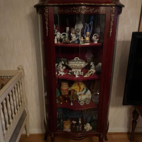 Antikt skåp med två glasdörrar och trästomme. Skåpet har dekorativa beslag i metall och låsdetaljer. Passar för förvaring för skor, bestick mm och som möbel i olika rum.
