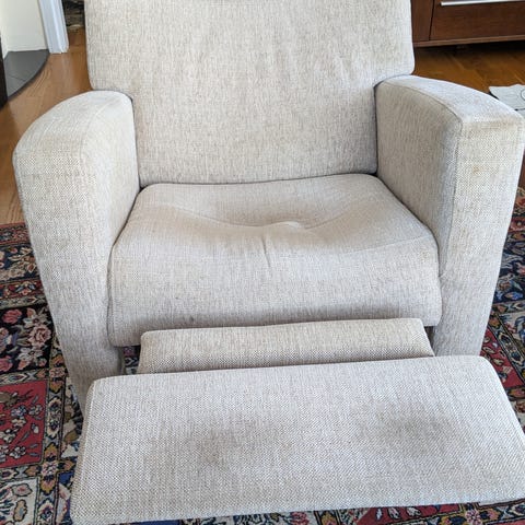 Puffarna är helt ok , men stolen behöver kläs om . Köpt på fd Grönbergs , snickargjord. Skön att sitt i.