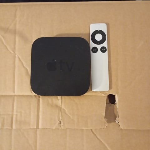 Toshiba TV RL953N 32 inklusive Apple TV-enhet 2:a generation, fjärrkontroll, strömkabel och HDMI-kabel. Produkten är svart och avsedd för anslutning till TV för streaming av media och appar. Väggfäste för Tv ingår.
