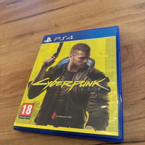 Cyberpunk 2077 för Playstation 4. Spelet levereras med originalfodral och inkluderar tillhörande spelmaterial och böcker med tema Night City.