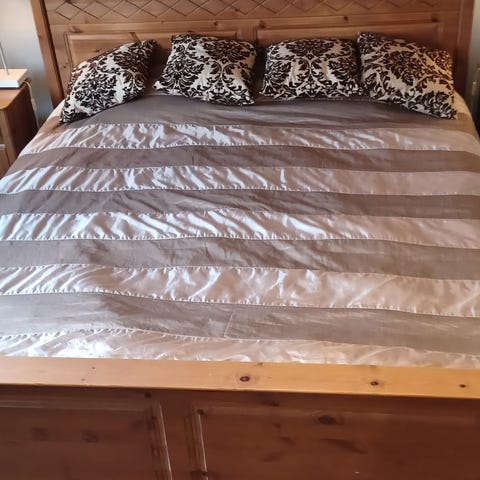 Dubbelsäng i massivt stabilt furu. Lantligt o lite ”retrostil. Välbevarad. Med två separata resårmadrasser, den ena hård den andra medium.