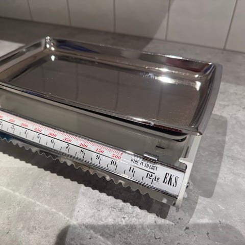 Äldre personvåg av märket EKS. Använd som inredningsdetalj i badrummet.