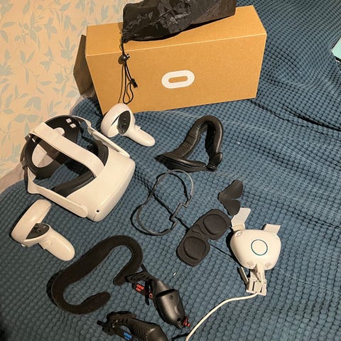Meta Quest 2 VR-headset i vit färg. Utrustad med justerbar huvudrem och inbyggda linser för virtuell verklighet. Kompatibel med trådlös användning och inkluderar handkontroller för interaktion i VR-miljöer.