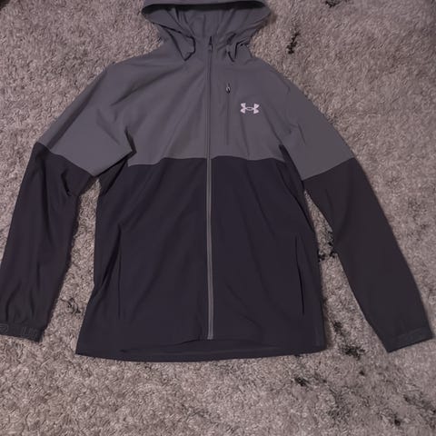 Säljer en snygg tvåfärgad vindjacka från under armour i svart och grå.jackan har också huva med snöre,dragkedja.perfekt för dig som gillar något sportigt stil