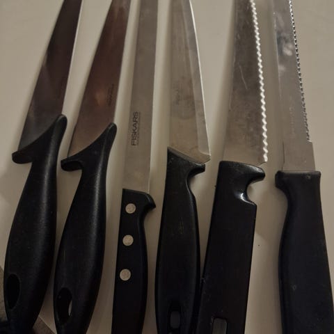 Jag säljer ett set med knivar. Det finns några repor på handtagen, men de fungerar bra. Hela setet kostar 130