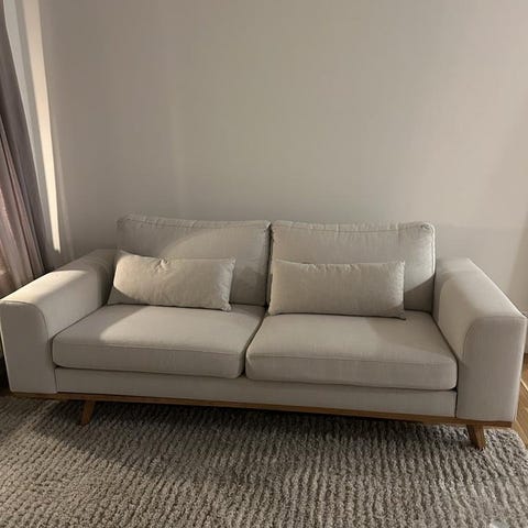 Mjuka dynor ger bra sittkomfort. Avtagbar och tvättbar klädsel. Katt finns i hemmet, vilket innebär att trådar sticker ut på sidorna av soffan och spår av katthår kan förekomma.