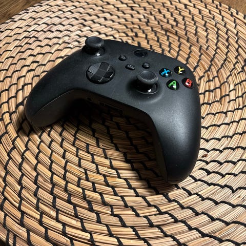 Microsoft Xbox trådlös handkontroll i svart färg. Handkontrollen är designad för Xbox och PC-spel och har en ergonomisk form för komfort vid spelande.