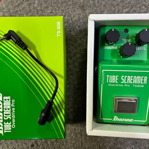 Ibanez TS9 Tube Screamer som är i bra skick, förutom att batteriluckan saknas. Vet ej när den är ifrån men det kanske kan uttydas från serienumret.