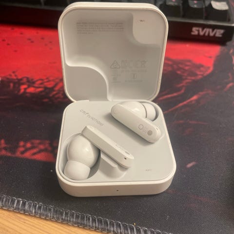 trådlösa hörlurar med laddningsfodral. Hörlurarna är vita och levereras med extra öronproppar och en USB-laddningskabel. Laddningsfodralet har en digital display som visar batteristatus.