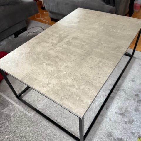 Soffbord Jysk Okslund säljes. Bordsskivan är i massiv akacia med svarta metallben. Mycket gott skick.