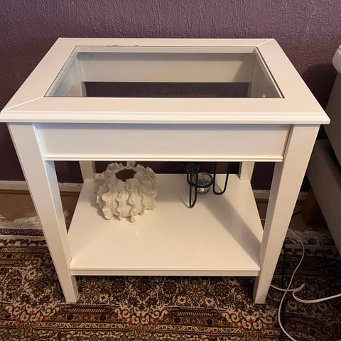 Gjort av vitt härdat glas på hyllorna med rostfria ben och kanter.