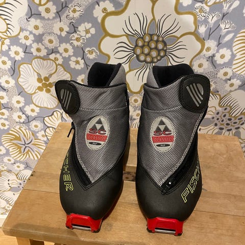 Fischer längdskidpjäxor i svart och gul färg, storlek 38. Pjäxorna har dragkedja framtill och är avsedda för längdskidåkning.