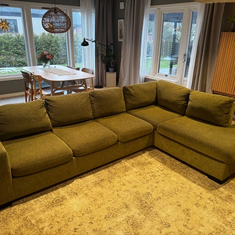 Skön blå soffa County med divan 500 kr. Fotpall ingår. Fräsch och fin. Hämtas i Stora Slågarp. Först att hämta får köpa.